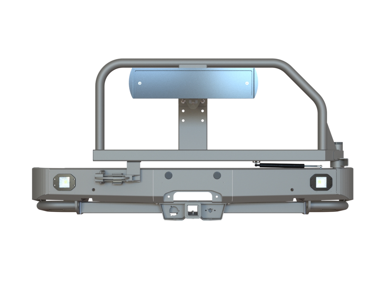 Калитка представляет собой конструкцию из квадратной трубы 60 мм и стенкой 4 мм, способную выдержать вес больших колес без каких-либо деформаций (37×13,5 R17 – гарантированно). Калитка оснащена надежным замком, способным выдержать вибрации и тряску и исключающим самопроизвольное открывание во время движения. Газовый упор облегчает ее открывание и удерживает калитку в открытом положении когда машина стоит под углом.